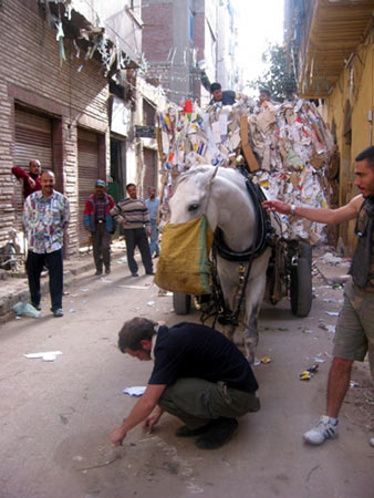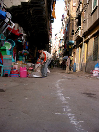 Eric van Hove is an artist who was born in Cameroun, studied in Belgium and now lives in Tokyo. His performance takes place this afternoon. Concerned with text, he has chosen one of the oldest parts of the city to write his poem for the city of Alexandria. Bending down on the narrow street, he starts to write in white chalk, a poem of one long sentence that continues for street after street. Eric never looks up or rises from his hunched and concentrated writing position, discarding each piece of chalk as it finishes, taking another from a pocket, writing round children who deliberately stand in his way, evading traffic, horses until after more than an hour, the performance is ended, and he stands at last and walks rapidly away.