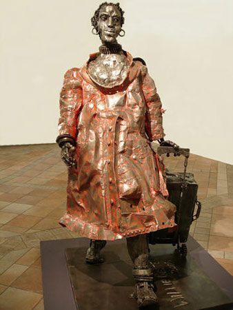 The monumental sculpture entitled New Arrival is an ambivalent representation of a woman traveling with a piece of modern but half-unzipped luggage. It is not clear whether the woman is part of a new generation of migrant labourers that have been forced to depart their homes in order to earn a living, or she is exercising a new-found freedom to travel. She was outfitted in an elegant red dress pieced together from the tattered shell of a vehicle culled from a scrapyard. The work is a powerful demonstration of Bester's ability to fuse the tragic with the sublime.