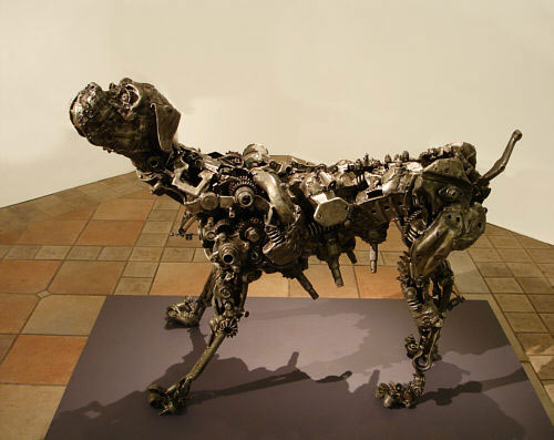 The pregnant dog standing within arm's length of the guard looked up at me with a pair of deranged eyes. I edged myself around her slowly and marveled at the brilliance of Bester's design. I could imagine him perched on top of an enormous scrapheap eyeing out exactly which parts he would need to create the sculpture in front of me. It is difficult not to stand in awe of an artist that can perform an act of modern day alchemy by transforming a pile of seemingly incompatible machine parts into an artwork, that is not only anatomically convincing, but on the verge of springing to life.