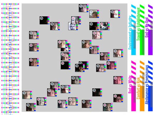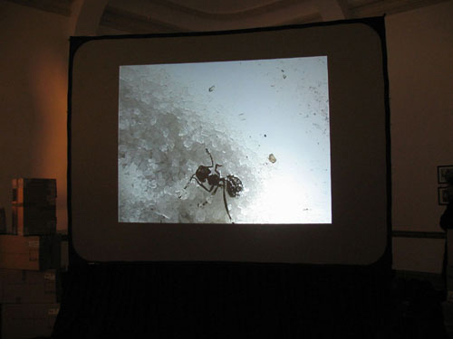 Inside, interactive pieces shared gallery space with more traditional forms, and oddball performance work such as Intersect's ant-for-the-evening interactive maze installation with video and sound. English artist Rob Fraser's sound installation highlighted his love-affair with the city of Durban. In an act of transgression, he filled the majestic foyer of the Gallery with the incessant kwaito-people-vehicular sound slam of the teksi experience. At the top of the stairs leading to the gallery space, Roger Miller's digital installation with a live performer and data generator grew and mutated as more people interacted with it.