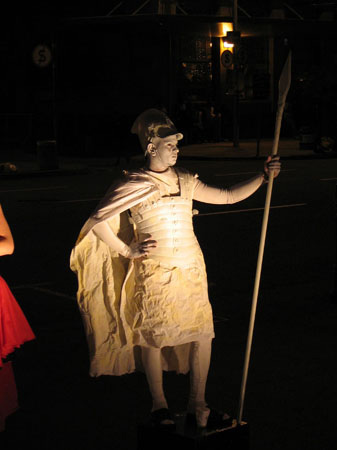 Outside, in front of the Gallery, a stage jutted into the street where prissy models from the Linea Academy's fashion show got leered at by rough-looking street people (one model told me her skirt was almost pulled off by a street kid) and local bands Deluxe, Rouge and Habit To did their best to rock out. The Royal Hotel, usually constrained to its staid interior, spilled out into the centre of Smith Street and competed with Indian 'aunties' to feed the crowd. The Mkhumbane Blues isicathimiya group and Durban favourite Big Idea added a uniquely East Coast 'flava' to the evening's proceedings. Niel Coppen's performance piece, presented on the stairs leading up to the Gallery, was lost on the too large crowd watching it, but looked like it could have been entertaining. Unfortunately, sitting to the side and near the back, meant that I didn�t hear a word the performers said. Later, a DJ and Ntokozo provided the ambience for a late night, 'drinking beer in public' street-party where preppy artfags mixed with Nigerian families in traditional dress.
