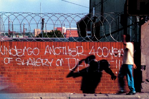 Artists Thando Mama and Rudzani Nemasetoni, for example, reflect differently to how the state defined identity. Nemasetoni uses images from his family's 'pass books', the notorious South African identification book that black people had to carry. Mama uses his own body as a site for the recovery of meaning and power associated with the black subject. Artists look at a variety of complex issues particular to the new South Africa such as urbanism, xenophobia, violence, AIDS and poverty.