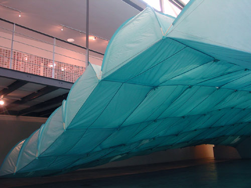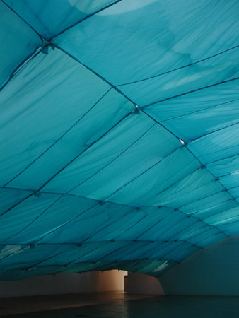 Kendall Buster's installation, titled Model City, had the greatest impact on me visually. The installation of over 40 blue child-sized tents was suspended across the main gallery. One could view the work from beneath upon entering the space and from above, looking down from the Mezzanine Gallery . Standing underneath, the effect of the clear blue sky was claustrophobic, and seen from above, the hints of wave-like shapes were enough to make one nauseous. The installation was spectacular, almost surreal. But only after viewing some of the trading cards on offer by Siemon Allen, did I realise that these were in fact tents. Tents that are used as portable shelter, like those used by the army. This is in marked contrast with Buster's Model City, which is essentially a tranquil turquoise-blue cityscape.