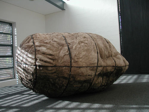 With the examination of aspects of war in Buster and Allen's work it was not difficult to link this to Ledelle Moe's large cement and steel sculpture Memorial (Collapse). This enormous sculptural piece has been created out of several components, forming the shape of a large, toppled head. This work recalls recent world events, particularly the toppling of massive structures such as the public monuments of Saddam Hussein in Iraq. The work ironically also invokes notions of vulnerability and pathos, in spite of its scale. The placing of the sculpture in an outside space as opposed to inside the park gallery, with the grey carpeting, would have been more effective.