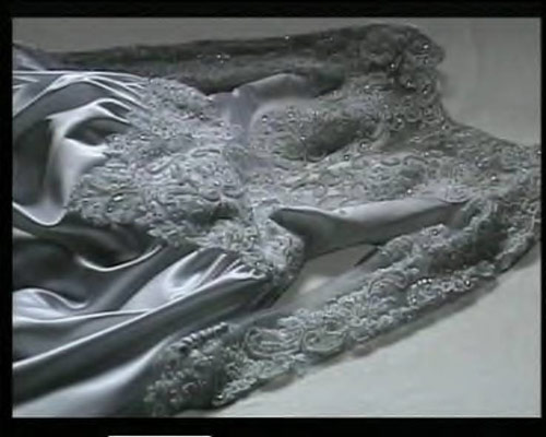 That seems rather heavy for such a short film and it is perhaps the more subtle aspects of the work that speak more eloquently. A dress lovingly spread out in anticipation of a big event - perhaps a wedding - turns over time into a dress of mourning. The white satin and beads on a lacy bodice turn through incremental plays of light into a dark grey evening dress and, finally, a funereal black garment.