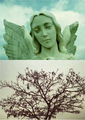 Gravestone sculptures, for example, are given otherworldliness through the use of different exposure techniques, cropping and juxtaposition with other completely unrelated images. It is too the repetitiveness of similar images that have been altered in a small way that is visually intriguing.