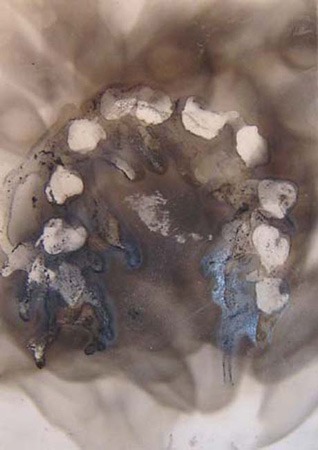 Some of the more playful elements of the exhibition were evident in Vuyile Voyiya's To (G)art(H) or Not. This video work was merely documentation of Garth Erasmus performing his candle drawings at Greatmore Studios. Voyiya agreed to film it. Erasmus was not aware that Voyiya was to present this on the exhibition and saw it there for the first time, hence the title of the piece.