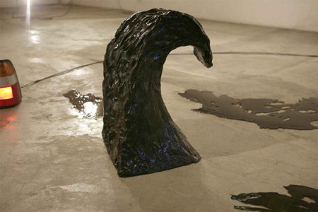 Possibly the most aesthetically desirable and one of the more successful pieces is Slick, a black resin wave reminiscent of Hokusai's famous and threatening Great Wave off Kanagawa, surrounded by puddles of oil, which appeared as shining controlled areas on opening night but have slowly seeped onto the floor over the course of the show. Though this iconography is interesting, the über-threatening black wave commodified through its neat, shiny plasticity yet still oozing a worrying noxious substance, within the context of both its title and the exhibition as a whole, the piece seems stripped of its potential for multiple interpretations. Instead, Slick, begging association to an oil slick, seems to lead to a direct interpretation as a work about the dangers of pollution and the harm that automation causes - an unfortunately literal and rather innocuous statement of fact.