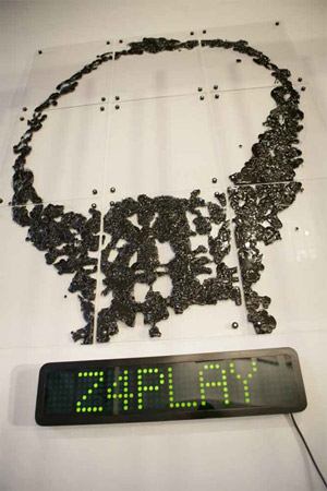 On the wall facing Slick is I, a piece that most clearly, and cleverly, describes the car as a vehicle for personal identity, folly and excess. It shows a large Rorschach ink blot made up of pieces of glass and tar on a large acrylic sheet - a personality test that is already perilous to the viewer. Under this is an LED display, like those advertising boards at service stations, which flashes what are at first meaningless texts in capital letters such as 'Z4PLAY', 'NIKKI14'. Some are, offensive, some possessive and many contain recognisable names. After some viewing the text starts to seem familiar, revealing itself as words from personalised number plates. Often referred to as 'vanity plates', these embody the ultimate in both self-obsession and constructed public identity where drivers pay large sums to advertise something about themselves.