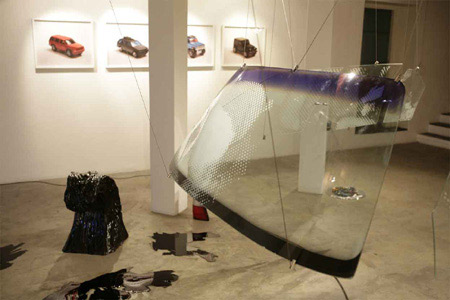 The title of Escort provides a nice pun for a piece that I can only assume deals with the inscription of gender onto cars, which are invariably referred to as 'she', and the deviant sexual relationship that men can construct through these vehicles under their control. A car's windscreen, back and side windows are suspended from the ceiling and arranged as if they have somehow just lost the rest of the car - windows looking into nothing, set in nothing and suggesting a particular kind of voyeurism. This notion is extended as the viewer is encouraged to step inside the space of this ghost car and begins to notice images sandblasted onto the glass. The problem, however, is that it is particularly difficult to discern what these images represent. When standing in the furthest corner of the gallery one can almost make out what might be a woman performing some kind of erotic act, but it's hard to tell. The dated, hackneyed and here over-sanitised use of oversized benday dots (a lä Lichtenstein) also makes it a chore to spend time reconstructing an image and is logistically an unwise choice for such a small gallery.