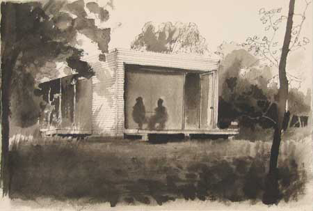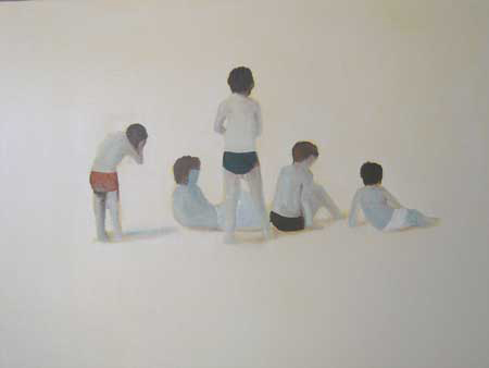 The works reiterate the need or longing for a home or place to which to belong. The houses act as a metaphor for this feeling of displacement, especially when positioned alongside grouped figures like Boys on the Beach. Works like this are interspersed with solitary portraits of individuals. In some cases, the houses are empty and deserted with no presence of life, such as the aged-somewhat-nostalgic Sepia House, which depicts a house that could exist in perhaps any time or place.