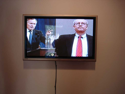 The video pieces are supported by a series of prints of details from the murders and the media event that paralleled it, including forensic images from Wayne Williams' house, details of his bedroom, microscopic pictures of fibres found on the bodies of the victims and stills from the news media. Journalists stand as if engaged in a midnight vigil projecting mock concern as they probe the surface of the events for the 8 o'clock news bulletins.