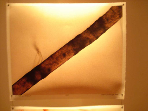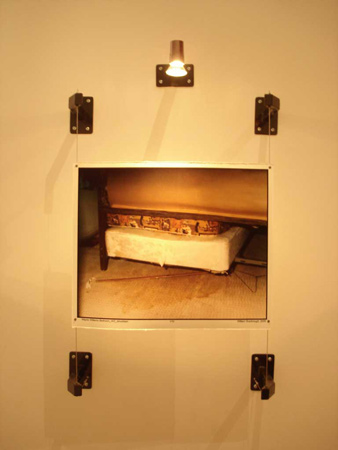 There are a number of visual and physical cues that extend the tension of his enquiry, from the banally self-referential DV camera capturing footage off a PDA and relaying it to a projector, to the rigorous and controlled lighting system he has installed along with his almost manacled still images. The world of the carceral (prison), the one that Wayne Williams now occupies, is extended into the gallery space. A notice warns: 'This area is under constant video surveillance, your actions are being recorded'. The lighting is dim and the overall impression is of a contrivance for the means of control.