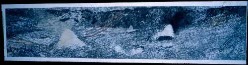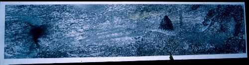 Scale has always played an important role in his images. Their size intensifies their power and presence, and creates a crucial intimacy. This interest in scale also frequently allows the works to mirror the landscapes they reference. In a pair of works from 2000, Blue Stretch, Johannesburg Réunion and Volcanic Presence, Réunion, their panoramic width (181cm and 230cm respectively) seems to signal the seemingly infinite width of the horizon as viewed from an aeroplane in transit between these two places. Pre-Linguistic Landscape, from the previous year, measured a dramatic 440cm in width.