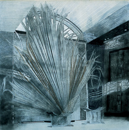 Also on this show are a number of monochromatic drawings Nel has produced following a number of visits to an uninhabited island in the Seychelles in the Indian Ocean, entitled In the Presence of Leaves,. Harking back to his 1996 show at the Art First Gallery in London entitled 'View on the Inner House', these works deal with the concepts of house and home, the abode which represents an emotional and spiritual security as much as it provides a physical haven. Nel's decision to eschew the spectacular colour of the 1996 show and render these images instead in muted monochrome was the result of a desire to capture something of the constant closeness of natural sound on this uninhabited island - the continuous yet intangible sounds of water, wind and a sense of the presence of a life force. The results are powerful investigations into tone, texture and scale.