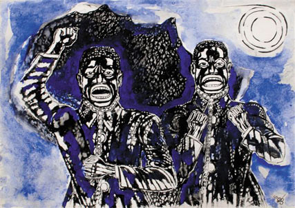 This exhibition at the DAG comprises a small but choice selection of works on paper as well as a display of memorabilia. A number of drawings on the exhibition provide fascinating insight into Sekoto's working methods. One example is the Study for The Donkey Cart (1946), which is a study for an oil painting. The sketch captures the essence of the scene in a few, brilliant strokes. A comparison with the final painting shows a number of detailed changes all of which result in a more taut composition and is evidence of the care and attention Sekoto devoted to the work.