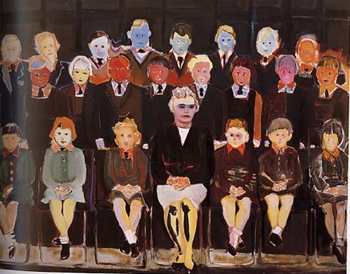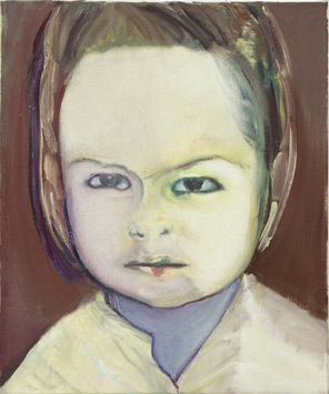 Her 1991 series, First People, portrays four dyspeptic babies, each almost two metres high. Originally photographed from above as they lay on their backs, now painted vertically, the babies, with their cross faces, distended bellies, flailing arms and scrawny little legs radiate a furious energy. The artist has jammed them into the picture frame like dolls in boxes which are slightly too small, thus increasing, as she often does, the level of discomfort.