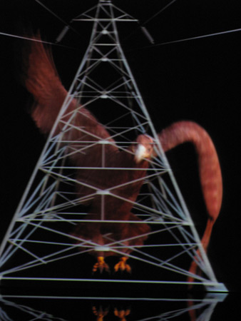 Barbara has a sheaf of invitation cards in her hand, and after each venue has been breached, the card is torn in half and discarded. The highlights for me: Robert Wilson's video portraits of owls at Paula Cooper and Gary Hill's new installation at Barbara Gladstone. Here, a long low tank of black oil reflects a video projected on the end wall of a pink eagle trapped inside an oil pylon. The eagle's wings keep flailing and hitting cables leading from the pylon with the sound of a bull whip.