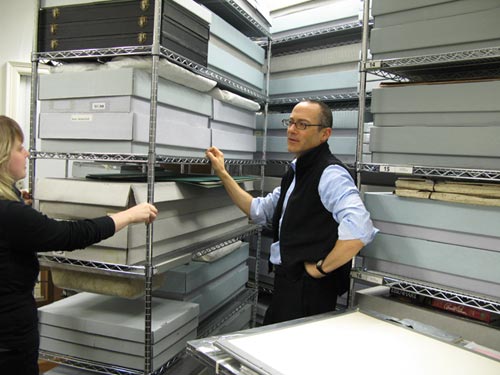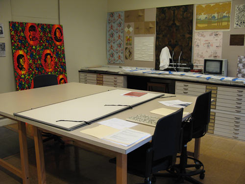 The wallpaper samples are wrapped in glassine paper, slipped inside acetate folders, and kept inside flat drawers or in large boxes made of grey archival corrugated boards and stacked on racks. Thousands of them. The oldest sample dates back to 1670, and is printed and flocked in dark olive greens. There are artist-designed papers - dominatrixes printed in transparent inks on foils - Allen Jones - Warhol's famous cow's head papers, handmade Tracy Kendell papers with white on white cut squares stitched in rows, but also dozens of nondescript designs like little fleurs de lis of beige on darker beige.