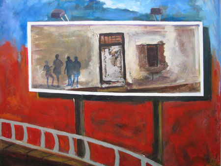 Influenced by Hopper, Masereel and Stagg, Robert Balfour focuses mainly on streets and buildings of Durban in 'Intimate Aversions' in which the night is explored as an 'othering' influence on identity in the city. Employing oil and acrylic paints to create highly textured and rough surfaces, colour and form clash as highways end abruptly, figures taper into neon signs and become part of buildings or struggle to escape them. At night the city is both sealed by darkness and defined by light. Grey Street landmarks, easily identified by day, become unreliable at night as streets and buildings disappear into darkness. And, what appears as night 'life', flickering neon signs, or the twinkle of sodium lamps over the harbour water, can suggest, just as easily, desolation and abandonment, activity or energy.