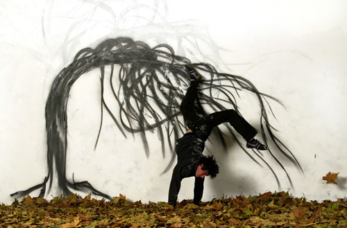 I came across a picture of a Robin Rhode performance in the Netherlands entitled The Storyteller in which the artist appears to be falling out of a tree bent over by his weight. The drawing of the tree is a marked development on Rhode's early drawings, which were always graphic, but often dead simple, and the image shows again how Rhode continues to develop his themes and skills along his chosen path.