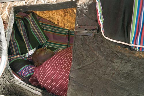Webb's confessional chaise-longue is also dominated by Moshekwa Langa's paintings. The calming iconography of the psychoanalytic institution is subverted by these portraits showing figures hovering on the edge of expiration or exhilaration. In The Last Sigh the breath becomes a threatening element inelegantly permeating the figure until he appears smothered by his own exhalation. The vital, everyday process of breathing becomes suffused with menacing undertones and the rhythms of survival become metaphors for existential crises. Penny Siopis' Feral Fables is concerned with the 'changeling' and the 'wild woman'. These are not the linguistically enabled subjects of contemporary culture but similarly liminal creatures. Liminality proposes the ability to be in a state of flux and permanent transition - existing between two states. The liminal is essentially subversive because it has no respect for the boundaries of states of being. Whilst the journey to the transcendental involves the inevitable loss of self/body, the liminal refuses loss.