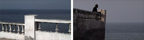 Zineb Sedira's video Saphir is an understated but mellifluous duet composed between two parallel video streams which the artist nudges in and out of confluence. This technique is deployed with sumptuous skill, exquisitely frustrating our desire for narrative closure. The two streams image different aspects of the same cityscape, that of the port of Algiers. Playing with clichés about sexed spaces, Zineb locates her separate protagonists within their respective spheres: a woman in a domestic interior and a man walking outside on the waterfront. Their disconnection from each other is emphasized by the occasional confluence of the two streams of video that show the same moment from two detached perspectives. However despite their mutual disengagement, the similarities, the strange confluences between the two versions of the city presented by the couple, become apparent. Both consistently look beyond their environments towards the horizon. Thus the woman, framed by the curtains of her majestic abode, gazes upon the exterior walkways, whilst her masculine counterpart looks towards the expanse of sea that separates Algiers from France. Their bodies exist in one space, but their minds are directed elsewhere. Sedira's video encapsulates a calm quotidian rhythm under which hovers an undercurrent of repressed longing and of thwarted desire.
