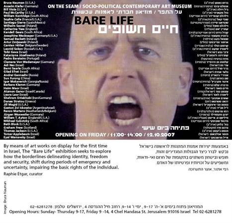 By means of artworks on display for the first time in Israel, 'Bare Life' seeks to explore how the borderlines delineating identity, freedom and security shift during periods of emergency and uncertainty, impairing the basic rights of the individual.