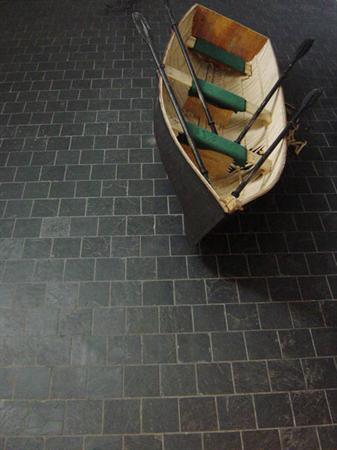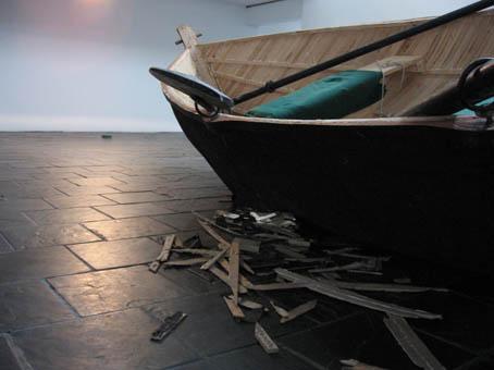 The manner in which the audience behaved on opening night suggests that this myth making has been rather successful: a triumphant example of 'relational aesthetics' at work. Seeded and spread by the pair's blog, most people at the opening seemed to know the story, and were busily gossiping about it. As such, the boat possessed a certain aura; like the body of a saint, a now broken vehicle which had miraculously transported its makers on a journey to hell and back. This story seemed to influence the manner in which viewers interacted with the work: rather than maintaining a respectful distance, the viewers violated boundaries and touched the piece. Crouched alongside the boat, heads cocked and ears attentive, pilgrim's fingers ran along the tar on the outside and rubbed the felt to see if it ought to be more dilapidated,