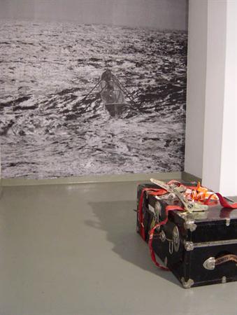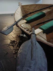 On May 9, according to the blog, Gimberg and Nerf, accompanied by Barend de Wet, 5 litres of Aquelle, some sandwiches and three energy bars set out in the pair's recently completed rowing boat for Robben Island. They were assailed by '8-11ft waves' and had to use their water bottles to bail out the boat, but against the odds they made it to the island, mooring safely on a small jetty. They were then approached by two island security guards and asked for their permits. Following a long debate, eventually they were made to get back in the little boat and row all the way back to shore and safety. On May 12, 'One More Day to Regret' opened at the AVA. On exhibition, the angasi nkosi angasi nkosi (I don�t know thank you/please god) rowing boat, with a tear in its fragile hull, the wood splintering away onto the floor.