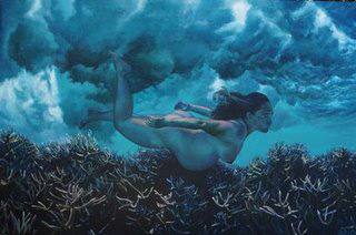 Solomon, whose technique is at times breathtaking, explores several ideas in her work and generously shares her thought processes with the viewer in a question-and-answer session which is so well presented it becomes an artwork itself. She is not one to eschew tradition, and the insight into the unravelling of the iconography of images from art history is fascinating, affording us a deeper understanding of her work whilst locating it in an established lineage. She brings a lush, sensual quality to her canvases, which seduce and at the same time provide a glimpse of a darker environment. In this realm the human form attains a spiritual quality, marking her as part of a larger cosmos. The pregnant figure in Star of the Sea swims through a mysterious ocean and appears to contain identification with the foetus floating inside the body - exterior and interior merge into one universe. This is also evident in Susannah where the figure crouches in a forest vulnerable in her nudity whilst surrounded by a mystical glow. Her landscapes are surreal and nocturnal with a quality of mystery and other-worldliness, imparting to her work spirituality, fantasy and sense of the unknown.