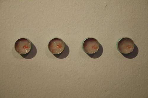 Approaching four tins, recognisable as containers of Vicks Vaporub (Bridget Baker's So It Goes (1996)), I noticed, in the furthest of them, a swirl of blood. Working backwards through the tins, I see the swirl resolving itself into a small but intricately rendered image: a faint suggestion of a young girl and an older man. The swirl appeared, at first, to be the start of a series of violent extrapolations, but was instead the ending of a gradual decline. The closer and closer I was drawn to the work, the more I was aware I could not smell the ointment.