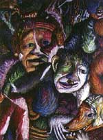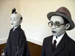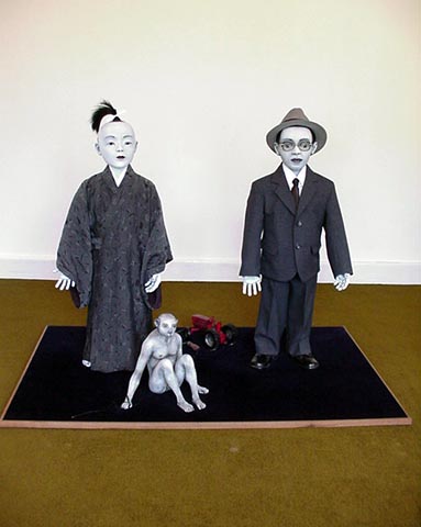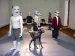 Alexander continues in her realistic figurative mode, her figures vacillating awkwardly between life- and doll-size. The Bom Boys are the height of a four or five-year-old child but seem to have the anatomy of someone a little older, although even this much is hard to be sure about. They are grouped in a tableau of nine human-like figures and one monkey/dog hybrid that stalks with trickery and power among them. He is entitled Harbinger, and it is this monkey-like figure that holds the key to the interpretation of some of Alexander's themes. In other works, he is portrayed as and entitled as a Harvester or he carries maracas in a carnivalesque fashion.