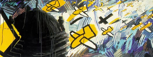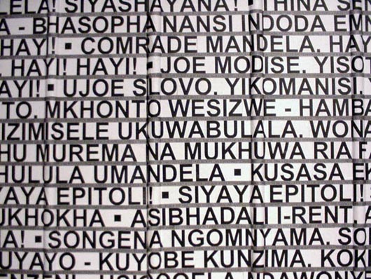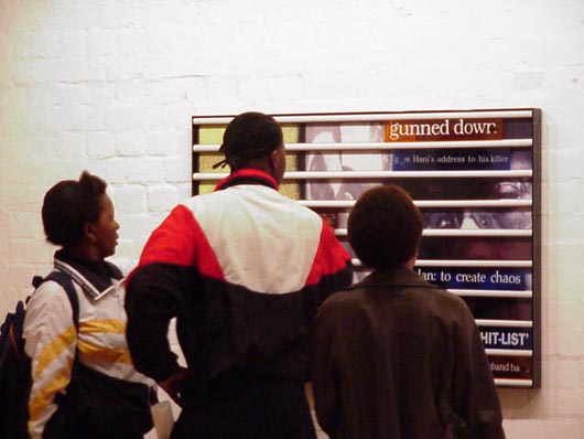 Notwithstanding the considerable handicap overcrowding places upon the work, one does get the impression that the selection represents an accurate summary of the most important artistic production of the past quarter century. And the curators have gone to enormous lengths to try and impose a vision and an order on a very diverse selection. A year by year timeline starting in 1975 printed on a wide strip of paper accompanies viewers at eye level up the stairs and round sections of the exhibition, listing major world news and popular cultural history events, and situating these alongside South African news and art milestones. Added to this, the curators have divided the work into seven main themes such as "Politics, ideas and the emergency of contemporary South African art", "Identity and the artist", and "Mind mapping" (conceptual art). Key works representing each of these themes have been surrounded by linked works, and hanging banners develop the thinking behind these themes. Additional text on the walls discusses particular pieces. Where a seminal piece has not been available for exhibition - like Jane Alexander's Butcher Boys - it has been represented by a photograph of the piece.