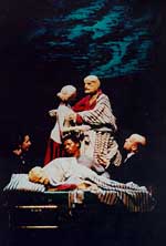 This quote is by William Kentridge, and the vulnerability of human flesh, and its indebtedness to chance and time, is the theme of Ulisse: ECHO scan/slide/bottle. The three-screen projection is in the Theatre in the Round at the Monument Theatre, in that darkened, hidden space below the main stage. In a previous incarnation at the Vita Awards show at the Sandton Civic Gallery, it was possible to see all three screens at once. Here, the pumping medical bottle, the windscreen-shaped wedge with its shifting landscapes, and the photographed surgical close-ups interspersed with medical drawings which flower into trees and mutate into landscapes are on three sides of the circular room. A bony ribcage dissolves into a block of flats, and the ribs become balconies … which begin to collapse when the building implodes … one is captivated yet again. A wholly successful venue.