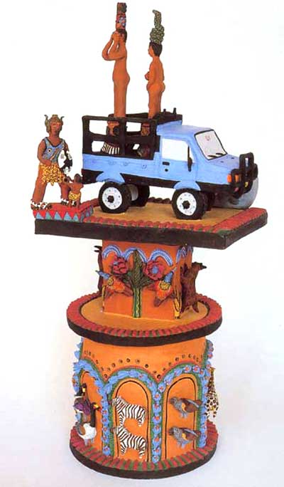 One of the brightest stars of the Ardmore Ceramic Centre in KwaZulu Natal, Bonnie Ntshalintshali, died last week at the age of 32, a victim of AIDS. Exhibiting on the prestigious Aperto section in the Corderie dell'Arsenale at the Venice Biennale in 1993 and on the 1st Johannesburg Biennale in 1995, Ntshalintshali's skill lay in building marvellously rich, complex ceramic pieces which combined witty elements of daily life with biblical stories and images refelecting Zulu traditions and culture. She was born at Ardmore in 1967 and after a mission school education, started in 1985 to work as studio assistant to ceramacist Fee Halsted-Berning. The talent which was to bring her international fame flowered quickly. In 1990, the heights reached by mentor and student were recognised when the two were named joint winners of the Standard Bank Young Artist Award, entailing a touring exhibition which opened at the National Festival of the Arts in Grahamstown. Ntshalintshali constructed her pieces by coiling the clay, or building from solid forms, stacking element upon element, then firing at 1200 degrees, before decorating in intricate colourations. Most recently, her work was part of a show of ceramics called 'Down to Earth/Okuvela Emhlabeni' curated by Peter Visser which opened at the LongHouse Reserve venue in East Hampton, New York in August 1998. The show continued to Santa Fe, New Mexico, where one imagines local artists must have been struck by the affinities between Ntshalintshali's elaborate and multi-faceted pieces with similarly complex and colourful ceramic art found in Mexico. Her work is in the collections of the SA National Gallery, the Durban Art Gallery, the Tatham Gallery in Pietermaritzburg, the Johannesburg Art Gallery, and UNISA, Pretoria.
