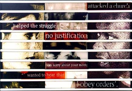 By Paul Edmunds Sue Williamson presents a series of interactive works entitled 'Truth Games' at João Ferreira Fine Art. The works are composed of images lifted from media sources which pertain to recent cases investigated by the Truth and Reconciliation Commission. Each work comprises an image of perpetrator, victim and the alleged violation. A horizontal grid is layed over the composition, and into this is inserted a series of moveable panels inscribed with quotes from the relevant hearing. The viewer is invited to participate by sliding the panels, thereby altering and questioning the events and their telling. Richly coloured and subtly composed, the works reflect on reconciliation, shifting truths, uncertainty and subjectivities. Opens October 18. The gallery can be e-mailed at joao@iafrica.com. |