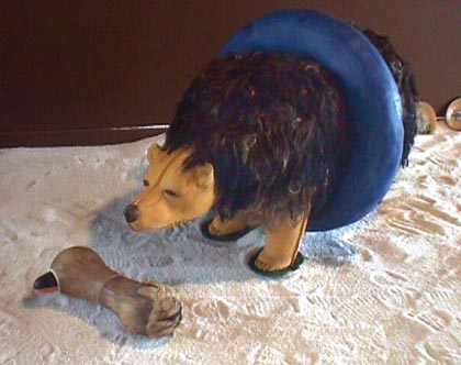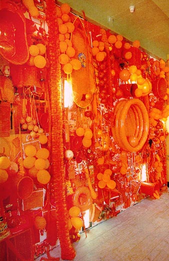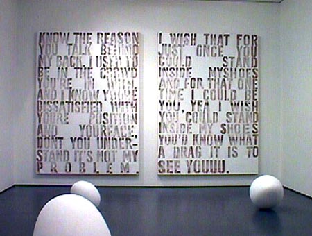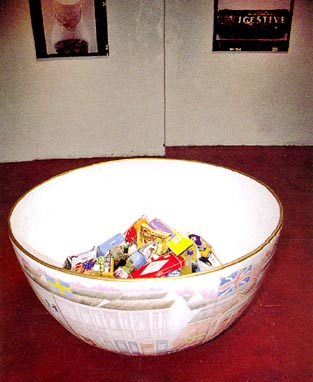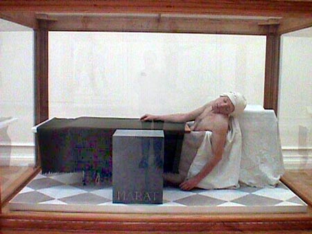 Monday, September 21: Here in London! Where to first? There's always something worth seeing at the Tate, so it's a good place to start. At the back, in the Project Room, is a show by Fiona Tanner - text meets canvas. Tanner takes texts of popular culture, and in some way transfers these to wall pieces. Three room-high canvases have the words of Dylan's You Gotta Lot a Nerve cut out in stencil style. The letters make shadows on the wall. The stretchers supporting the canvas are clearly visible. The piece is loose, relaxed, yet controlled and satisfying. On the floor, oval, round, or cube shapes in white polystyrene turn out to be full stops in six different typefaces blown up 1800% and given volume. In stories, says the artist, full stops are almost unnoticed, but indicate that very important point, THE END. She is giving them some attention. Again, the quirkiness of the concept provokes a slight smile. Cape Town artist Lisa Brice is in temporary residence at the Gasworks, the London equivalent of Johannesburg's Bag Factory and another Robert Loder initiative. The Gasworks is not exactly inside one of those huge green drum structures, as I'd always vaguely imagined, but a white three-storey building next to the gas tanks. There's an exhibition space on the ground floor, and about 12 smallish studio spaces. Johannes Phokela is one South African artist working here, and past residents include Claudette Schreuders and Leora Farber. The talk among the artists this morning is whether Chris Ofili will win the next Turner Prize, or indeed, if anyone else has a chance against him. He would be the first black artist to win. Ofili is English born, of Nigerian extraction, and, after a workshop in Zimbabwe where he saw elephant dung handmade paper being sold to tourists, decided to use the dung in his own work, as a jokey response to his African ancestry. Since he lives in London, this dung is delivered to him by the London zoo - a further muddling of references. The mounds are used as collage elements in his large colourful canvases, which are also rich with brilliant colour, and dots which float in layers of resin. Tuesday, September 22: Elke Krystufek is showing at the Emily Tsingou Gallery off Oxford Street. She is the artist representing Austria at the São Paulo Biennale this year, and one of the so-called "bad girls" of art. This show is called 'A Kind of Beauty' and consists entirely of photographs, drawings and videos of Krystufek by the artist herself. There is a gallery warning that the video is "pornographic". If you are prepared to sit through about 15 minutes of Krystufek panning sloppily over her untidy bedroom and her untidy studio you get to a part where Krystufek bares one breast, and having finally managed to pull a condom over a handy cucumber, spends the next 15 minutes using it as a dildo on herself, a process which judging by her pained facial expression is both tedious and uncomfortable. Thursday, September 23: Meet curator Nicodemus Heller to discuss his project 'Divide and Rule', which, if it comes off, will involve eight writers and artists, two each from Germany, Russia, Ireland and South Africa. In this case, I would be the writer and Barend de Wet the artist from South Africa. The Whitechapel Gallery has turned the project down. Now it is being considered by the Serpentine. We visit the Saatchi, where 'Young Americans 2' is up. A prosthetic leg by Martin Kersels is attached by a tangle of leather strands to a motor at the top of a wall. Periodically, the motor rotates, causing the leg to kick violently against the base of the wall. After I photograph this, the security guard tells me it is not allowed, so I can't show you Tom Friedman's wall with such pieces as a plank of pine painted to look exactly like itself and a chewed ball of bubblegum plonked in one corner of the room, and the strange paintings of Lisa Yuskavage and John Currin. At the South London Gallery in Peckham Road is Gavin Turk's 'The Stuff Show'. Turk is one of the YBAs - Young British Artists - who took part in last year's 'Sensation' show at the Royal Academy. Lisa Brice, who is with me, went to the opening of 'The Stuff Show' and along with all the other guests with their by-invitation-only cards found that all the sculptures and wall pieces had been wrapped so that nothing was on view - a joke not appreciated by many who had braved rush hour traffic to get to this obscure part of London. Now everything is on view, and a very strong show it is too. One life-size sculpture is a self-portrait of the artist as lurching, drunken bum, one eye almost closed, cardboard shoes on his feet. The major piece on the show is a masterly sculptural recreation of David's famous painting of the death of Marat, with Turk posed as Marat, not dead, but sleeping. Wall pieces include several versions of Turk's own signature - one fabricated from a rectangle of hundreds of white egg shells set side by side, with Gavin Turk pricked out of the shells on the diagonal across the sea of eggs. Lisa says she's glad she's made the effort to come back to see the show.