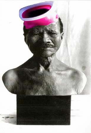 In the 'Leeu-Gamka Series' montages contrast images of roads, intersections and travelaars with paper dolls, illustrations from children's books and plastic toys. The romance of the open road and travel is as tenuously related to harsh reality as are the idealised, impossible worlds evoked by unnaturally perfect illustrations. Another series of photographs depicts what appears to be a rundown, weather-beaten miniature diorama of South African urban life.