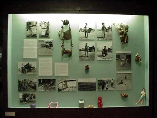 Aside from a video which was not operational at the time of my visit and several wall-mounted photographs, 'Chafe' takes place in already existing museum display cases. The first intervention is lengthily entitled Anthropologists Use Artefacts to Define the Cultural Patterns that Characterise Society. A series of black and white photographs are displayed amid a collection of cheap plastic toys, a worn donkey bridle and several lifecasts of hands, presumably those of karretjie people. These are queasily life-like and obviously fake at the same time. They repeat gestures first seen in the accompanying photographs. A pair of hands holds the donkey bridle in a pose taken from an adjacent photo which shows an old man holding the bridle up, his stationary donkey-cart behind him. In another, a child holds tokens collected from chip packets, and his gestures is repeated by casts. Wilby realises that he can never be an objective observer; both he and the subject project a fiction of their choosing. By allowing the subjects to pose so obviously, and presenting the work in so self-conscious a fashion, Wilby acknowledges this position. The title of the work draws attention to this fact: that there is no way to view this objectively, that even so innocent an item as a mute artefact can be use to construct any desired fiction.