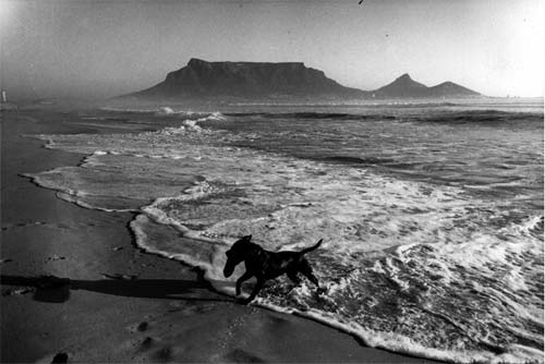 In some instances, the subjects of Derrick's social documentary works people the landscapes. A photograph from her widely exhibited and published project on sex workers in Cape Town (1998), shows four transvestites lounging in the foreground of a vast stretch of beach, with Salvador between them, running with a stick in his mouth. His forward-propelled energy contrasts with their horizontal mode; the dark tones of the figures, dog and seaweed contrast with the lightness of sand and sky. The latter are separated by the mid-tones of sea on the left and dunes on the right, converging at the vanishing point. The tiny figures in the distance and the scuffles in the sand in the foreground emphasise the vastness of the beach.