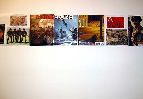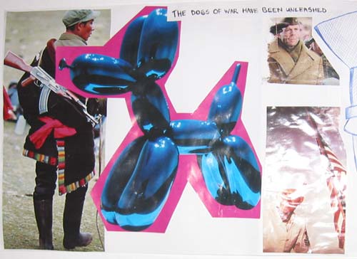 Food Court, for example, juxtaposes images of gourmet food with images of starving Africans, which I can only read as a vapid comment on global inequality. Don't You Know I'm Loco presents us with a pastiche of frightening baboon teeth, fight scenes, Mohammed Ali reading Psychological Warfare, sumo wrestling, and rappers in shiny cars. Jackson Pollock also appears above text that reads, "When I get Jack to Rippya."