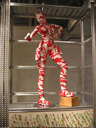 Kendell Geers constructs a museum of African/other art within the museum, using steel factory shelving and panels of poured concrete set with shards of broken green glass for his enclosure. His 'exhibits,' ranging from flea market African artefacts to a Shiva figure to a statuette of Lara Croft are all wrapped in Geers' signature chevron tape.
