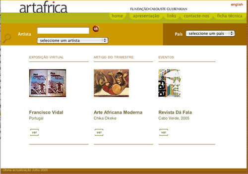 The Portugal-based Calouste Gulbenkian Foundation recently launched their ArtAfrica website. This site is a rich resource of information on Portuguese speaking artists from across the African continent. The site's outspoken goals include raising awareness of art from Portuguese-speaking countries in Africa, as well as stimulating debate around the works by these artists.