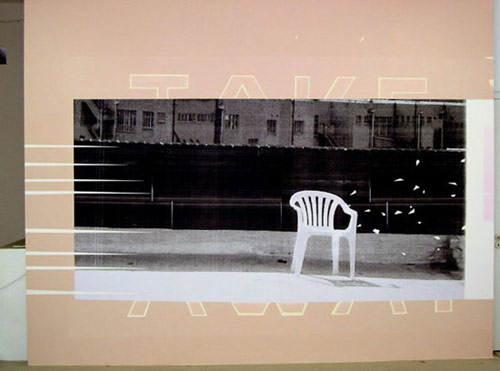 One of the first shows of the Month of Photography, 'Sweet Nothings', curated by Sanell Aggenbach opens at the Bell Roberts, interrogating notions of romance. A key image is Sanell's piece of a couple on a beach silhouetted against a flaming yellow sunset. Deliberately over the top. Dorothee Kreutzvedlt has been photographing abandoned chairs of the plastic garden variety around Johannesburg - her wall piece combines a black and white photocopy blow up of one of these images with painting.