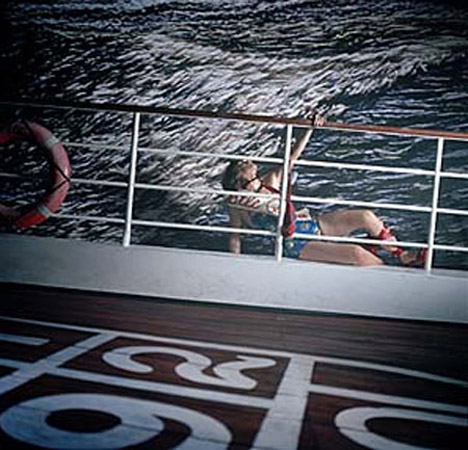 The 'Girls Night Out' show opens. Lots of people. Bridget Baker's piece is a standout - the artist has had herself photographed in a fifties style swimsuit, a Castle Queen sash around her, semi strangled by the red ribbon of one of her shoes. apparently about to fall into the sea from the deck of a liner. The staginess of the setup is reinforced by a closer inspection of the sea - a blow up of a piece of embroidery. Apparently the piece is a reworking of her mother's honeymoon experience as shipboard beauty queen.