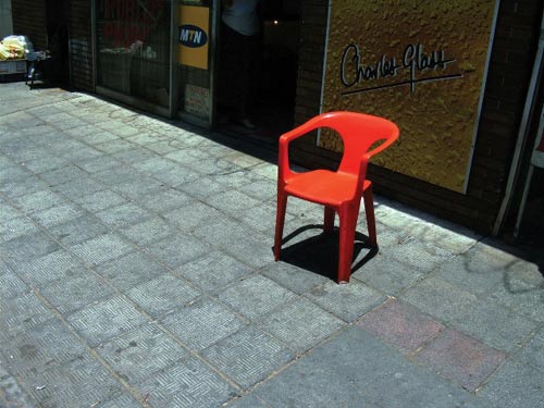 Aggenbach's lovelorn sentiments are reflected in Dorothee Kreutzfeldt's blown-up image of a single chair, which is plastered across one wall of the gallery. Kreutzfeldt also photographed single Love Chairs around Johannesburg that appear in the show's small accompanying catalogue.