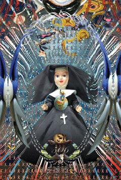 Slowly meaning emerges from this welter. Payne addresses the clash of ethnicities and faiths, and the violence this provokes in the contemporary world. The thick-lipped black, winsome white and slit-eyed Oriental dolls redolent of racial stereotyping and prejudice, are interspersed with religious symbols. There are sprinkles of stars loosed from the Islamic symbol of crescent moon and star, present in so many of Payne's other images. There are also serried rows of stars of David and crosses. The latter obviously represent Christianity, but they also recall the sea of crosses in the French graveyards built on Second World War battle sites, and thus represent the carnage of war.