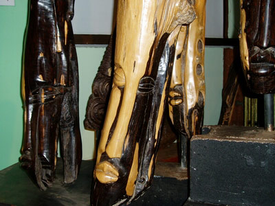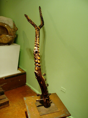 Another remarkable contemporary African artist that was on show at the NBFAS was Ousmane Gueye. The P.C.O.G. Gallery (partly owned by Gueye) presented some recent sculpture by this Senegalese artist. His man-high pieces are executed in mixed ebony, and form abstract musical instruments. They are named after famous American jazz musicians who Gueye heard on the radio as a young man.