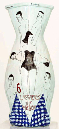 Over the past four decades Nel has developed a style of work that is rich in references to the decorative arts and literary and art historical sources. His ceramics are decorated with witty and sometimes poignant line drawings and script. On his functional ware, Nel's imagery ranges from penises to Madonnas, and from cats to angels, embellished by quotations drawn from poetry and the daily press as well as his observations of the world around him.